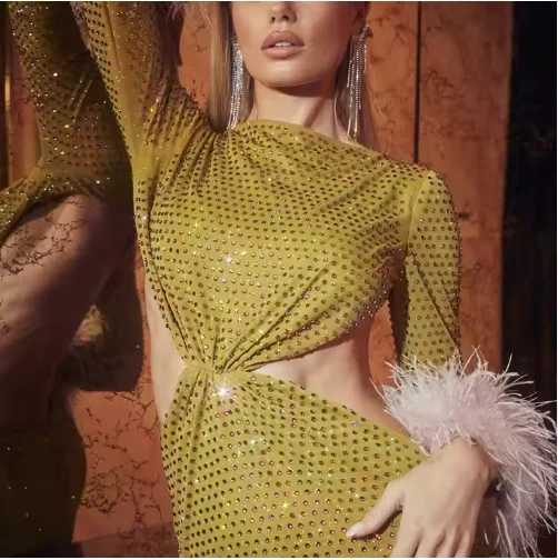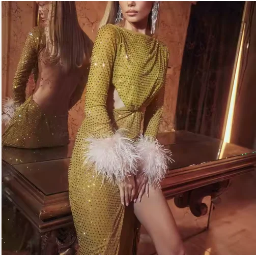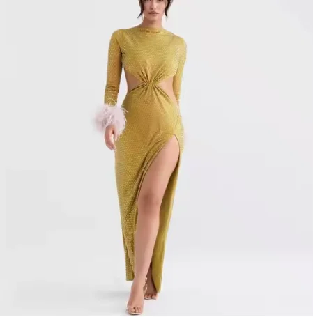 New Fashion Women's Casual Maxi Dress Crystal Feather Detail Long Lace Sleeves Anti-Wrinkle Eco-Friendly Spandex Natural